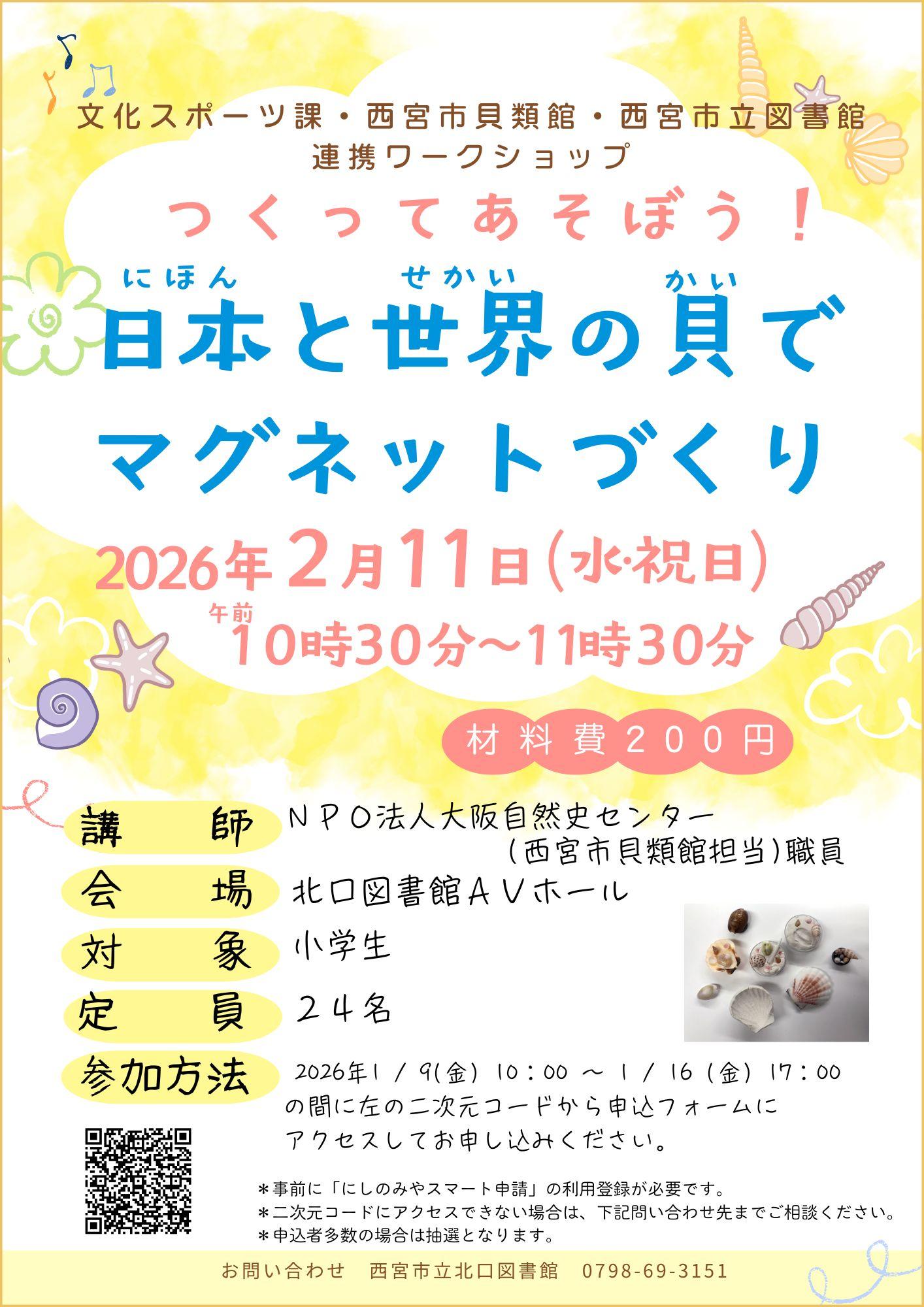 文化スポーツ課×西宮市貝類館×西宮市立図書館連携ワークショップ「つくってあそぼう!日本と世界の貝でマグネットづくり」