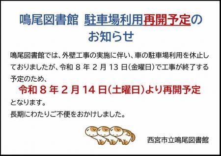 鳴尾図書館駐車場再開のお知らせ 最終更新日:2026年02月06日 鳴尾図書館では、外壁工事の実施に伴い、車の駐車場利用を休止しておりましたが、令和8年2月13日(金曜日)で工事が終了する予定のため、令和8年2月14日(土曜日)より再開予定となります。長期にわたりご不便をおかけしました。